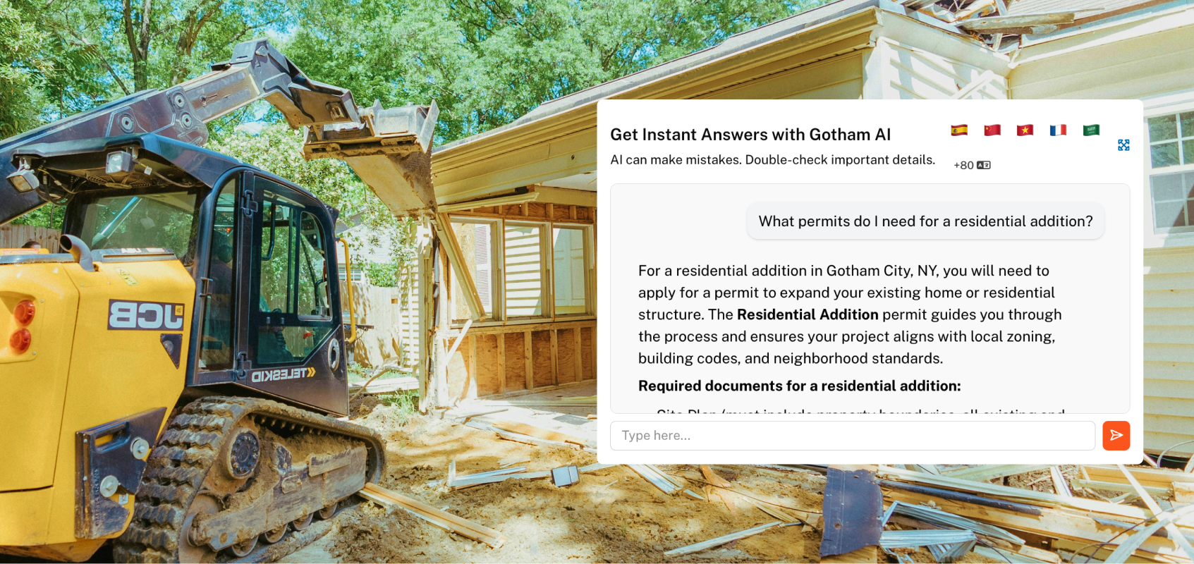 GovWell’s AI Community Assistant does exactly this. It allows residents and contractors to get answers 24/7 in their own language and directs them to quickly find the right forms, understand requirements, and get clarity on next steps. As Greg Seigfred, Director of Building and Codes in Perinton, New York, found, “Homeowners, especially, don’t have experience with building permits the way contractors do. Being able to pop open the chat and get directed instantly, any time of day, makes a huge difference.”